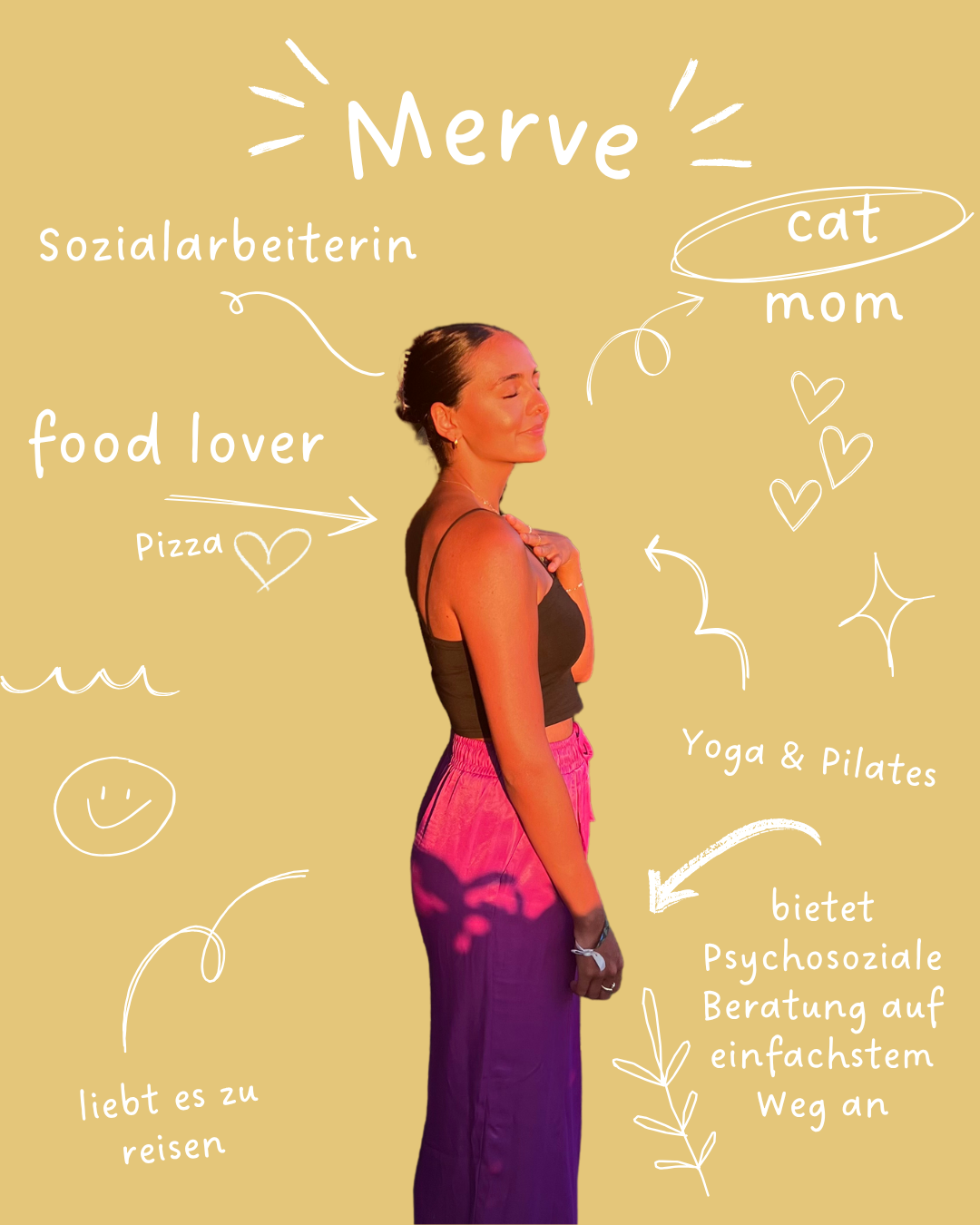 Ich bin Merve, Sozialarbeiterin und Psychosoziale Beraterin mit Herz und Seele. Schon während meines Studiums der Sozialen Arbeit und Management in Köln war mir klar: Ich möchte Menschen in schwierigen Lebenssituationen begleiten, stärken und ermutigen. Deshalb habe ich danach noch meinen Master in Psychosozialer Beratung gemacht um mein Wissen zu vertiefen und noch gezielter helfen zu können.